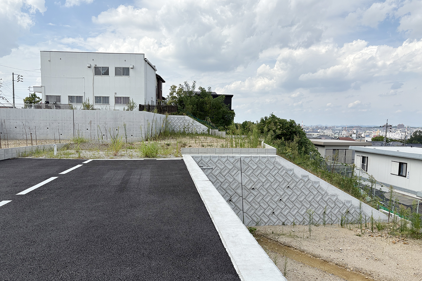 南側から現地を撮影しました。法面になっている斜めの部分もある眺望の良い敷地です。視界が抜ける開放感と隣地が気になりにくいゆとりの敷地。手前にあるアスファルト部分(左側)が道路に繋がる専用スペースです。