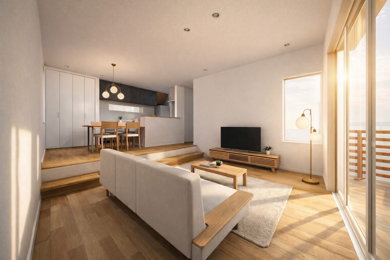 木の温もりとシックなキッチンが調和する上質なLDKです。