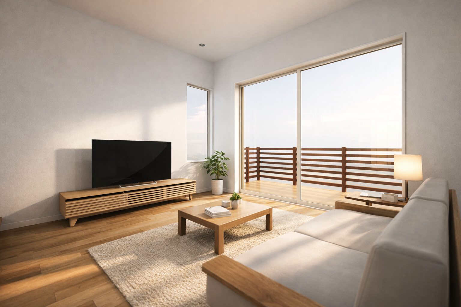 景色を楽しめるウッドデッキと、空間に緩やかな仕切りを生むダウンリビング。