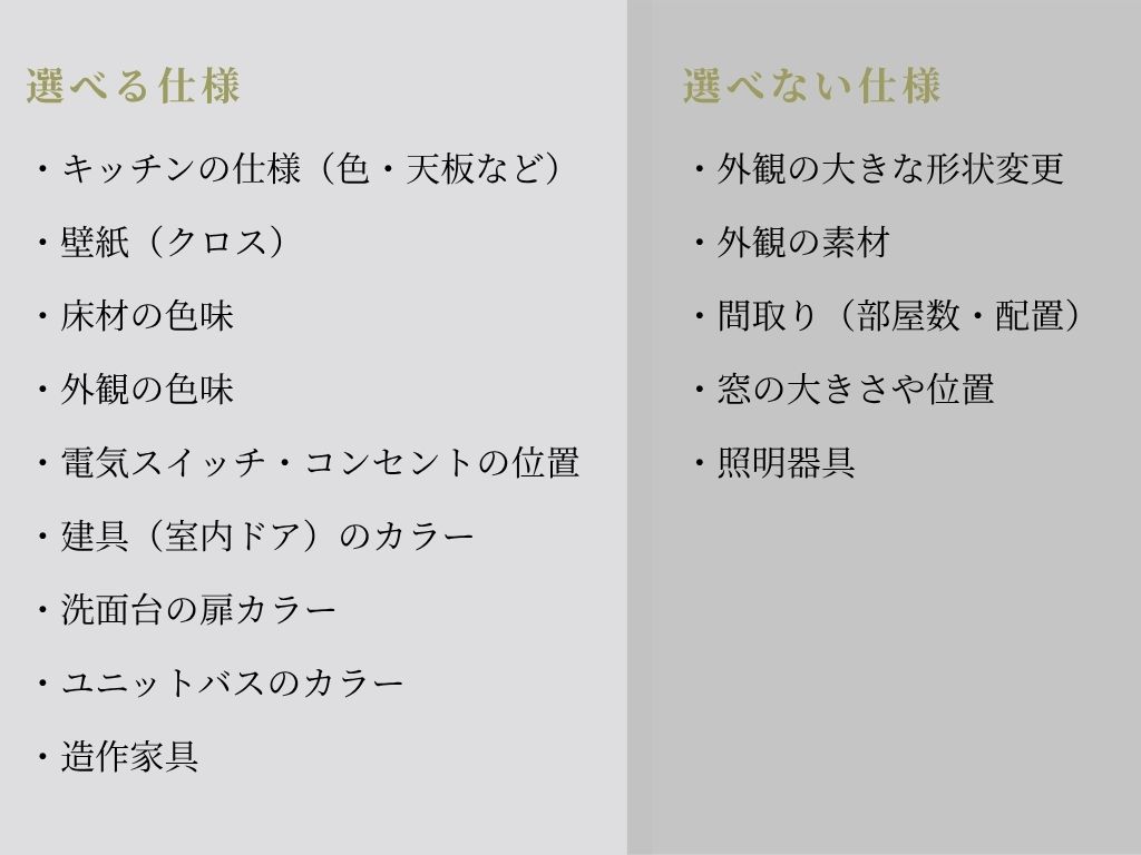 あらかじめ用意されたプランをベースに、間取りや仕様を自分たちらしく選べる住まいです。