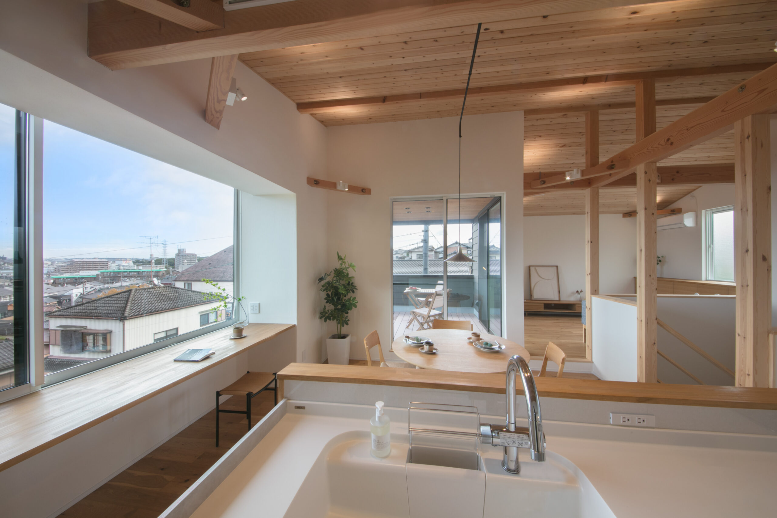 2階に玄関、LDKを配置した心地良い住まいです。北側の見晴らしの良さを活かしたリビングテラスは、周りの視線を感じないプライベート空間で、BBQなどお家アウトドアも楽しめます。室内は杉の羽目板を施した勾配天井、自然素材の塗り壁、無垢の床、造作家具など木の質感を楽しんでいただけます。